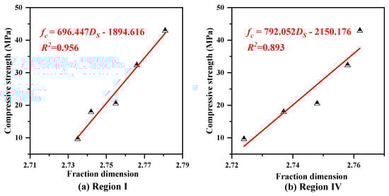 The pore with a large fractal dimension has a complex pore structure, meaning a stable accumulation mode of hydration products. Therefore, the amount and compactness of the hydration product decreased with the increase in MSWIFA content, resulting in a decrease in and and the compressive strength of the geopolymer mortars. It is reported that large pores have a greater effect on compressive strength than small pores []. Consequently, the compressive strength of mortars increased with the . The pores in Region I are considered harmless pores, while the reflects the degree of hydration and the pattern of gel accumulation. Therefore, the is also positively correlated with compressive strength. Han et al. also reported that the surface fractal dimensions in Region I and Region IV showed a positive correlation with compressive strength []. However, contrary to the report by Han et al., the correlation coefficient in Region IV is even smaller than that in Region I in this study. This is probably because the addition of MSWIFA increased the irregularity of pore distribution in Region IV.