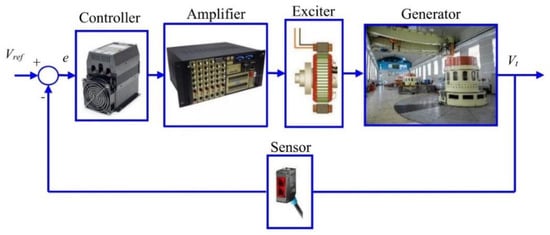 In traditional and modern EES, synchronous generators (SGs) represent the leading and most critical voltage-regulation devices []. At present, voltage regulation is achieved in microprocessor technology using AVRs [], i.e., excitation systems []. The AVR loop includes a large number of devices/elements: a synchronous machine, exciter, amplifier, controller, and numerous sensors, which are coupled into a single regulation contour together with other signals such as the value of the excitation current and generator currents, VHz signal, power system stabilizer (PSS) signal, and others. The common structure of the AVR system is depicted in Figure 1 [], where e denotes the error signal, i.e., the difference between the reference voltage Vref and the terminal voltage Vt.