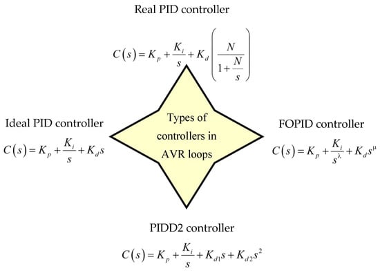 All the previously cited works deal with estimating regulator parameters or selecting new regulator structures. The most often employed regulator in AVR loops is the ideal proportional-integral-derivative (PID) regulator, which is characterized by three gains—proportional, integral, and differential (Kp, Ki, and Kd) [,,,]. However, as the ideal controller is impossible to be realized practically, publications also consider a real PID controller, which, in addition to the previous gains, also has a variable that represents the filter coefficient (denoted as N) [,,]. Namely, in this type of regulator, the derivative action is filtered. Besides, there is also the fractional-order PID (FOPID) regulator, in which the functional routine of the ideal PID is improved by adding fractional calculus into the typical structure of the PID controller [,,,,]. Therefore, in FOPID, we have two additional variables μ, and λ. Furthermore, recent studies investigate another amendment of the ideal PID regulator, the so-called PID with second-order derivative, or PIDD2 [,], or a mix between FOPID and PIDD2 called fractional-order proportional-integral-derivative plus the second-order derivative controller (FOPIDD2) []. Unlike the ideal PID regulator, the PIDD2 structure has one extra parameter to be four in total: Kp, Ki, Kd, and Kd2. Figure 2 shows the mathematical formulations of the mentioned regulators, where s represents the Laplace operator variable.