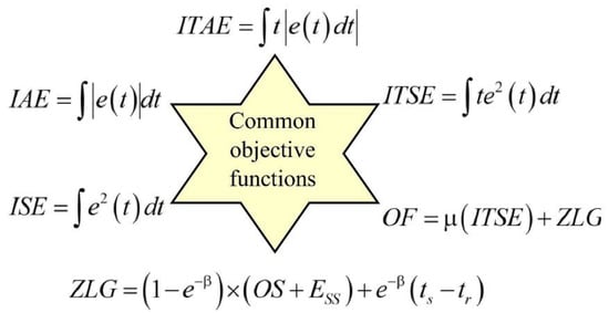 The parameters of regulators were estimated by minimization of the corresponding criterion function (or objective function) to achieve the best possible response, i.e., the desired response of the generator voltage when the reference value changed its value from 0 to 1 per unit (p.u) (nominal value). The most frequently used functions are depicted in Figure 3. ITAE represents the time multiplied by the absolute value of the error [], IAE represents the integral of the absolute value of the error [], ITSE is the integral of time multiplied by weighted squared error [], ISE is the integral of squared error [], ZLG is a well-known objective function named by the name of the author who first defined it (Zwe-Lee Gaing []), OF is an abbreviation for the criterion function of the composition of ITSE and ZLG [] and so on. For ZLG and OF, β and μ represent constants, while ESS denotes the steady state error, ts denotes the settling time, and tr denotes the rise time. It is apparent that no sole objective function is used in the literature to estimate the parameters of all PID controllers.