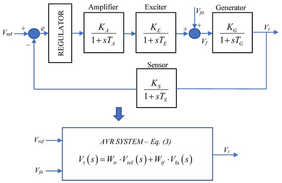 Figure 4 represents the AVR model with two input signals (Vref stands for the generator reference voltage, Vfa represents the additional field voltage, and Vt represents the generator terminal voltage). Suffix A represents the amplifier, E represents the exciter, G represents the generator, and S represents the sensor.