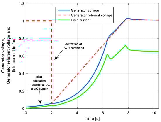 The generator is first accelerated to a speed higher than 90% of the nominal speed and is excited from the additional power supply (DC voltage source). As the generator rotates, its voltage will rise, as well as the field current. After a certain time, the initial DC power is stopped, and the generator starts to be excited via a predefined ramp function for voltage. Therefore, we have a ramp change of the generator reference voltage in the AVR contour. During this change, the field current tracks the generator voltage. After the generator reaches the nominal value, the synchronization system is activated, and the generator is synchronized with the grid voltage. The experimentally measured changes in the reference voltage, real generator voltage, and field current are presented in Figure 5.