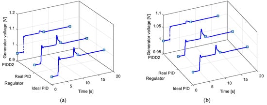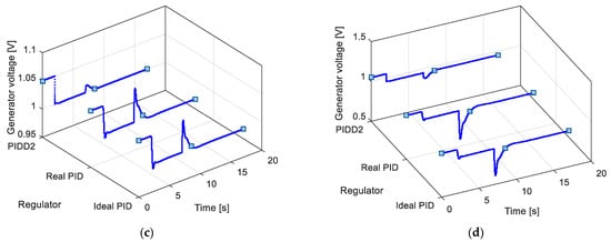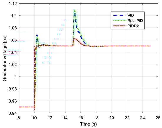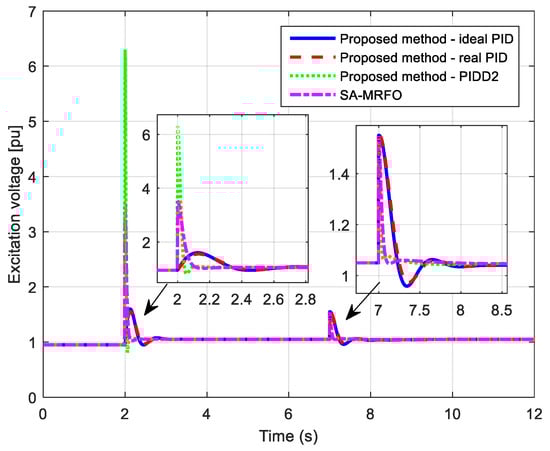 Figure 11 shows the excitation voltage responses that correspond to changes in the generator voltage for parameters determined by the proposed method/procedure (for the three regulators) and for PIDD2 regulators whose parameters are determined by the SA-MRFO method shown in []. It was seen that when the reference value of the generator voltage is changed, there is a considerable increase in the excitation voltage when using the proposed PIDD2 regulator. A similar situation also exists with the PIDD2 regulator from []. However, real PID and ideal PID remained within the allowed values. Therefore, if the limitation of the excitation voltage is also observed, it can be concluded that the parameters of the PIDD2 regulator are not well chosen because they do not guarantee the safety of the excitation winding.