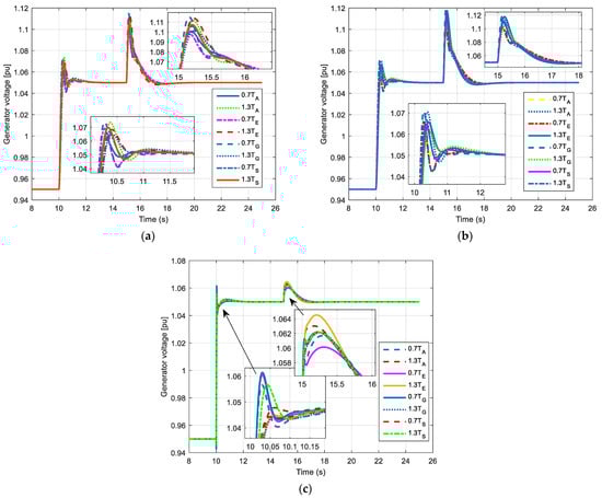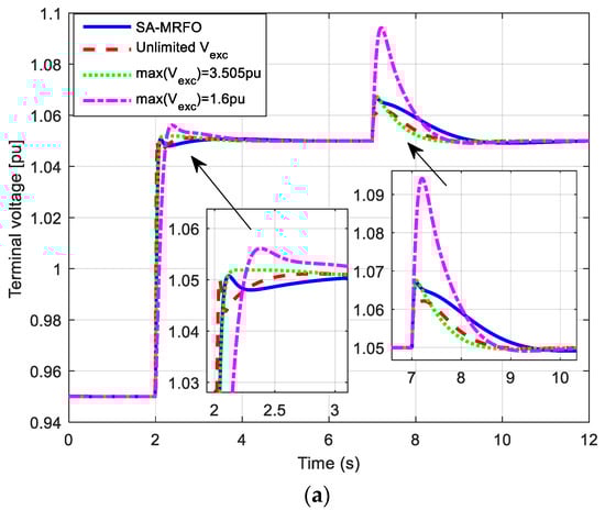 The previously conducted optimization of the regulator parameters and the overall analysis did not consider checking the maximum permissible excitation voltage value that can be formed when the reference value of the generator voltage is changed. Namely, it is known from the literature that the maximum allowed value of excitation voltage during operation ranges from 1.6 to 3 p.u, e.g., it can be from 1.6 to 3 times higher than the nominal value. However, forcing the excitation voltage to values more than 2 p.u is practically not desirable because the forcings will stress the magnetic circuit of the machine [,]. Due to the above considerations, an analysis of the excitation voltage values for the regulator parameters presented in Table 5 was carried out.