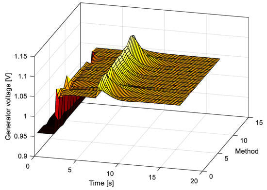 A few conclusions can be drawn out while observing these results. First, the proposed method enables better cancellation of the sudden variation of the excitation voltage change, unlike the method in [] for the same maximum excitation voltage value. Second, the small defined value of the excitation voltage causes a slower response of the generator voltage (increasing excitation voltage cause higher and faster generator voltage rise). Furthermore, this conclusion is the same as the concluding remarks in [] about the impact of the excitation voltage limitation. Third, the small excitation voltage limitation value causes the generator voltage’s worst response due to the excitation voltage change.