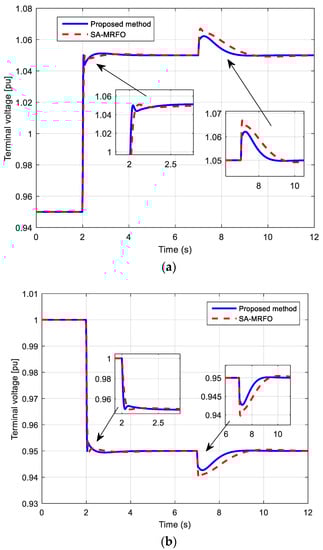 The generator voltage responses are depicted in Figure 10 using the regulator parameters obtained using the proposed method and SA-MRFO presented in []. These responses were obtained for changes in the generator voltage reference value and excitation voltage disturbance. Thus, from the responses presented, it is clear that the proposed SA-GTO enables the best system responses.