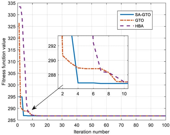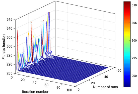 To show the advantages of the proposed algorithm over other literature-known algorithms, we also proposed algorithms tests in this work. In this regard, we observed two recent algorithms—the honey badger algorithm (HBA) [] and GTO []. For all algorithm testing, the numbers of population and iterations are set to 100, and 50 independent runs are executed. Figure 13 presents the number of runs—iteration number—fitness function values. Based on this curve, we derived the mean fitness function versus the iteration number curve shown in Figure 14 for all algorithms.