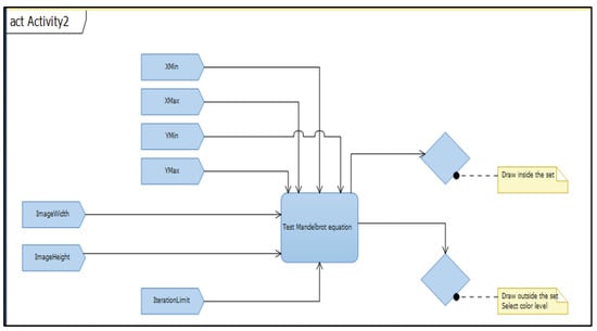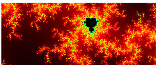 obtained by iterating The process starts from the main point, z = 0, and thus tends towards infinity or there is the possibility of it being maintained within a certain limit [35]. Furthermore, the Mandelbrot set is defined as the representation of all points, c, that do not converge to infinity. Another definition is also given by the fact that this set is a compact one distributed near the disk with a radius of 2 around its origin. Specifically, a point belongs to the Mandelbrot set if and only if for . The set can leave the limit if becomes greater than two, and the sequence will tend to infinity.