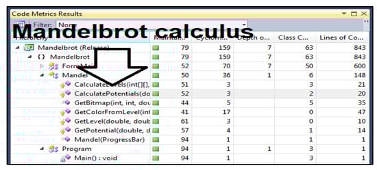 There are also more complex calculation methods, but these detect the possibility of stopping faster and include the possibility of calculating the distance from the origin to the point. Using the Pythagorean theorem, and in the context of the distance being greater than 2, the point has reached the end. Another method used to program this set faster is the Buddhabrot method [40], which is based on identifying the “escape” points and finding the areas where they are.