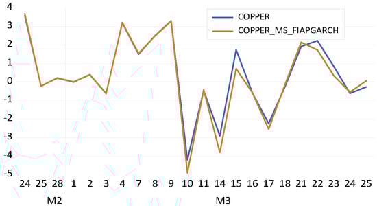 In Table 6, the coefficients of GARCH and ARCH determine the volatility in the selected variables. In both regimes for all commodities, the sum of ARCH and GARCH coefficients is smaller than 1, indicating the achievement of stability condition. However, the sum is close to 1 for majority of commodities’ regimes, an indication of the persistence of shocks towards future periods. Moreover, the ARCH–LM test is employed to determine the ARCH effect in residuals. The MS–FIAPGARCH models for copper and silver have a negative constant for first regimes and in R2 for gold. Cashin [77] found that the magnitude of price falls in a high–volatility regime at a rate that is larger than the magnitude of price rebounds, while the rate of change of prices in low volatility regime is faster than the volatility in prices in the high–volatility regime.