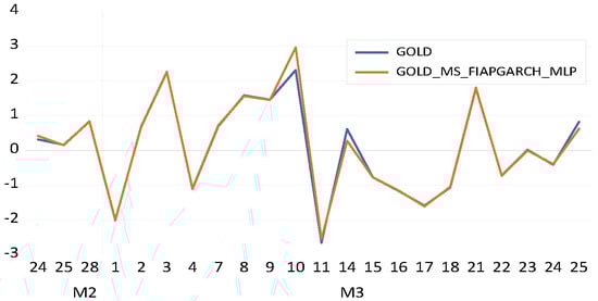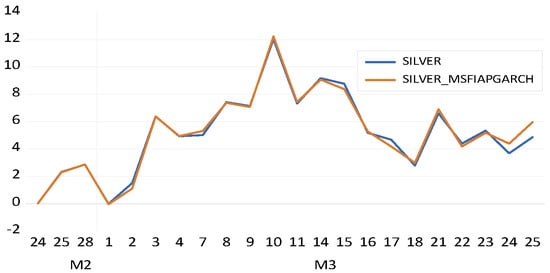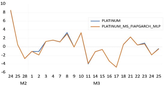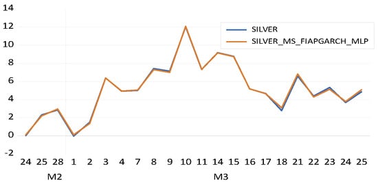 In this stage, forecasting performances determined by MSFIAPGARCH–MLP–copula and MS–FIAPGARCH–copula models are evaluated. The results are reported in Table 8. MS–FIAPGARCH–MLP–copula model for silver is the 1st model with the lowest RMSE in forecasting (RMSE = 0.123) which is followed by the MS–FIAPGARCH–MLP for gold (RMSE = 0.16) and MSFIAPGARCH–MLP for platinum (RMSE = 0.18) which take the 2nd and 3rd places, respectively. The 4th and 5th places also are taken by the MLP–augmented models. Thus, the neural network–augmented models show significant improvements in forecasting relative to their non–neural network variants.