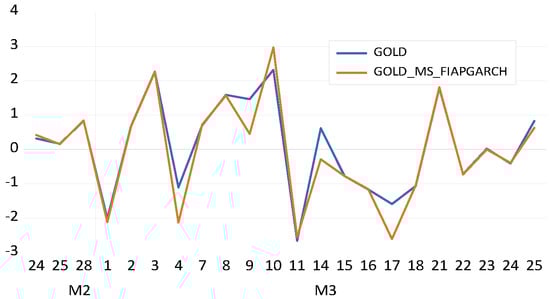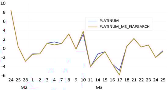 In Table 6, the transition probabilities of the estimated models are reported. Given the fractional integration parameter estimates, the second regime (R2) is characterized with higher persistence, except for gold % returns, for the majority of commodities relative to the first regime (R1). The overall investigation favors R1 as the high–variance regime with lower returns and R2 as the low–variance regime with higher returns. Hence, the R2 represents the low variance regimes with higher returns compared to the high–variance R1 with lower returns. Further, given the regime switching probabilities, persistence in R2 is relatively higher compared to R1 for all commodities. Similar results for precious metals can be seen in the works of Cashin [77] and Rossen [78], which determine the asymmetry of commodity price cycles. Another point is that the MS–FIAPGARCH model is capable of providing regime–dependent characteristics given above which are among the major advantages over its single–regime variant.