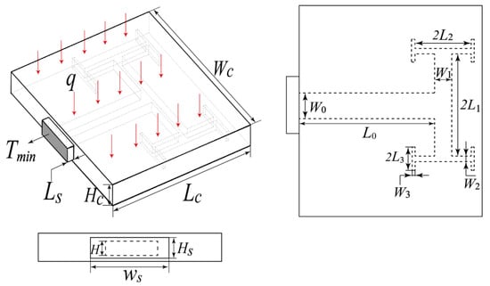 The schematic of a simulation model applied in the present work is displayed in Figure 1, which can be considered a simplified model of a heat-conduction-based cooling plate inserted with T-shaped branched HCM. The branching level of the branched HCM is 3 and the branching number at each level is 2 for the example given in Figure 1. In this simulation model, a T-shaped branched HCM with thermal conductivity of Kh is inserted into a rectangular chip with thermal conductivity of Kc. The rectangular chip can be considered a simplified model of the thermal spreader. The dimensions of the rectangular chip are Lc × Wc × Hc = 18 × 22 × 1.5 mm3. At the same time, a small heat sink with the same material as the inserted HCM is added to the outside of the chip to collect the heat from the chip through the transfer of the branched HCM. The dimensions of the heat sink are fixed at Ls × Ws × Hs = 7.5 × 0.8 × 1 mm3. The cross-section of each branch at any branching level is a rectangle with uniform dimensions. The length ratio and the width ratio of two branches at any two consecutive branching levels of the T-shaped branched HCM keep constant. The thickness of the whole branched HCM also keeps uniform. The main target of the present work is investigating the effects of various geometric and structural parameters of the T-shaped branched HCM and the thermal conductivity ratio of the HCM to the chip γ = Kh/Kc on the maximum temperature of the chip and finding the optimal geometric parameter of the T-shaped branched material with the best thermal performance for the cooling of the chip. The geometric and structural parameters of the HCM considered in the present work are as follows: