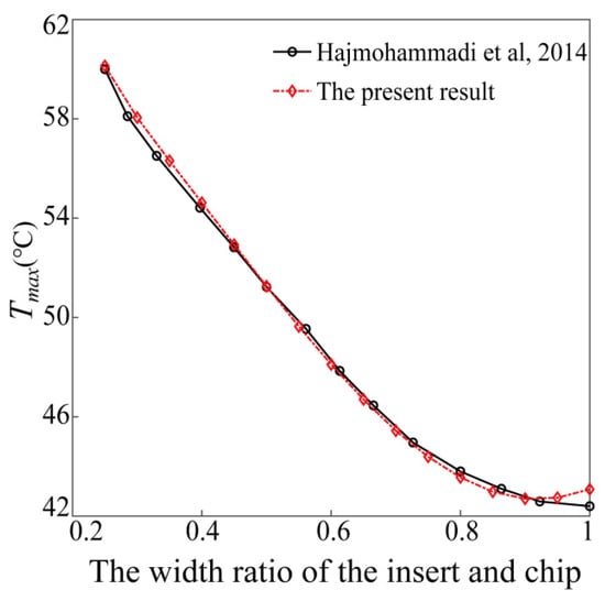 In addition to the mesh sensitivity test to ensure the accuracy of the numerical calculation, the data comparison in literature [24] is also carried out to keep the correctness of the present numerical method. In the literature, a highly-conductive rectangular material is inserted in a rectangular chip to numerically study its effect on the maximum temperature of the chip. Using the model setup in the literature, the data comparison of the maximum temperature calculated by the present method with that in the literature is given in Figure 2. It can be found that the results obtained by the method used in the present work are consistent with the results in the literature. This shows that the method used in the present work is feasible.