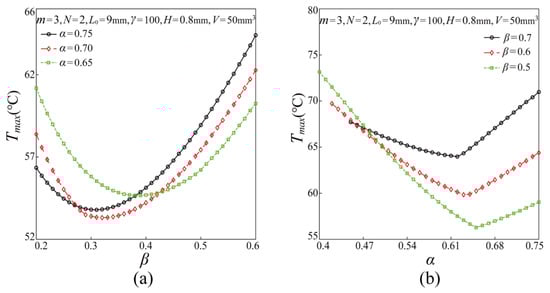 Furthermore, from Figure 3a, it can be found that the effect of α on the maximum temperature of the chip is a nonmonotonic change, and the maximum temperature of the chip shows the transition from drop to rise with the increase of α, which indicates there might be an optimal length ratio to obtain the minimum value of the maximum temperature of the chip. To prove this, Figure 3b gives the effects of α of the T-shaped branched HCM with different β on the maximum temperature of the chip. It can be found that there is an optimal length ratio to obtain the minimum value of the maximum temperature of the chip.