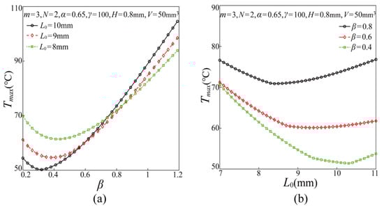 (a) Effect of β on the maximum temperature of the chip with different value of L0 (b) Effect of L0 on the maximum temperature of the chip with different value of β.