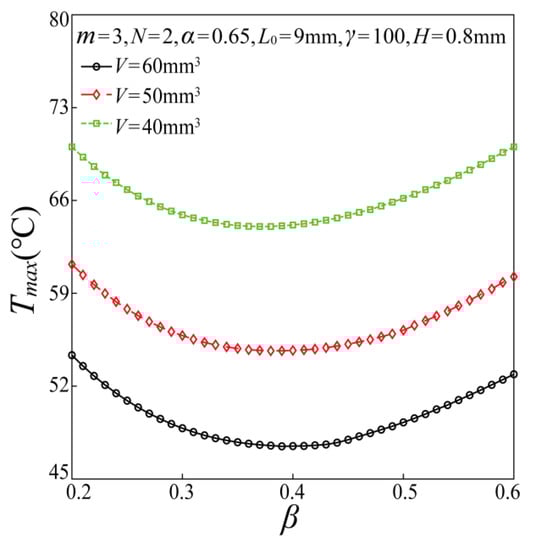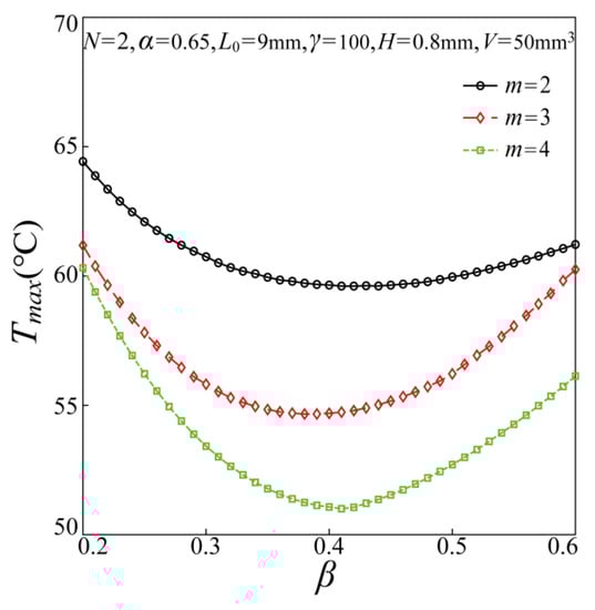 In Figure 6, the effect of β on the maximum temperature of the chip was studied by adjusting the fixed volume V of the HCM under fixed parameters of α, m, L0, and H. It is found that the increase of V is beneficial to enhance the heat dissipation performance of the branched HCM. The curve of the maximum temperature gradually declines with the increase of V. The main reason is that the heat exchange area will also increase with the increase of V, which further promotes heat dissipation performance and reduces the maximum temperature of the chip. This result is consistent with previous studies [26].