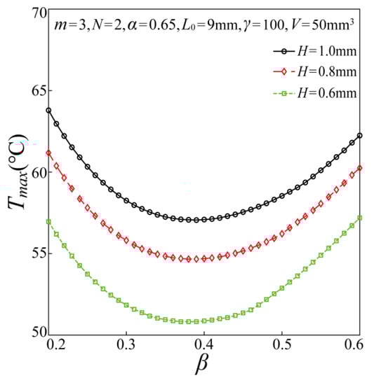In Figure 7, the effect of β on the maximum temperature of the chip was studied by adjusting H at fixed parameters of α, m, L0, and V. It can be found that the maximum temperature of the chip will gradually decline with the decrease of the thickness of the HCM, which means that reducing the thickness of the HCM can improve the heat dissipation performance of the HCM, which is also due to the increasing heat exchange area with the decrease of the thickness of the HCM.