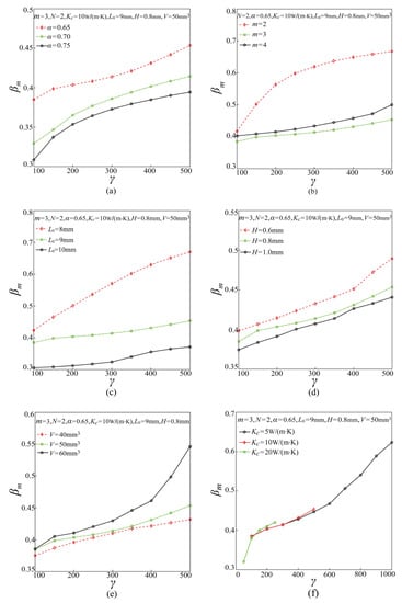 According to the above analysis, there exists an optimal width ratio βm to make the thermal performance of the branched HCM obtain the best; thus, it might be interesting and significant to investigate the optimal width ratio. Correspondingly, Figure 8 shows the effects of the thermal conductivity ratio γ on the optimal width ratio of the branched HCM with a different length ratio α, the maximum branching level m, the length of the branch at the initial level L0, the thickness H, the total volume V and the thermal conductivity of the rectangular chip Kc. It shows that the optimal width ratio of the branched HCM always rises with the increase of γ, which means with the increased conductivity of the inserted HCM, the branched HCM with wider terminal branches is preferred. In addition, the results are apparent in Figure 8 that the optimal width ratio decreases with the increase of α, L0, and H while increasing with the increase of V. Further, it can be found that the effects of m and Kc on the optimal width ratio are nonmonotonic change, which still needs further studies. At the same time, it is found that the optimal width ratio of the branched HCM obtained in the present work is not consistent with the findings of the previous literature [22,23] regarding the optimal structure of a fractal heat-conduction network with a single material. For the fractal heat-conduction network with a single material, its optimal width ratio is always equal to the reciprocal of the branching number at each level when the cross-section shape is a rectangle with uniform height. However, when the branched HCM is inserted in the rectangular chip with lower heat conductivity, the dual-materials system increases the complexity of optimization design and leads to the discrepancy with the single-material system.