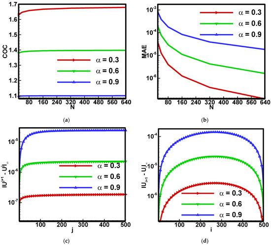 It is well known that the method is convergent beside each fractional-order derivative and its convergence order increases as. Figure 2c,d comprises the L∞-norm among the consecutive solutions i.e., and when 0 ≤ i, j ≤ N, M = 500. It has been established that the suggested method is very effective, reliable, and accurate for the considered problem. It also validates that the solution is unchanging against the fractional order mesh parameters.