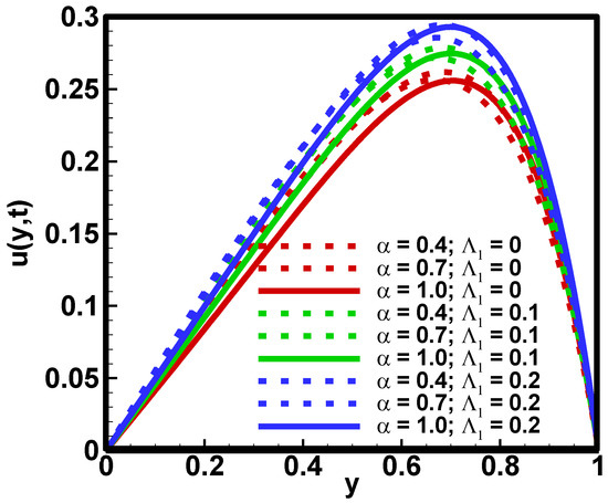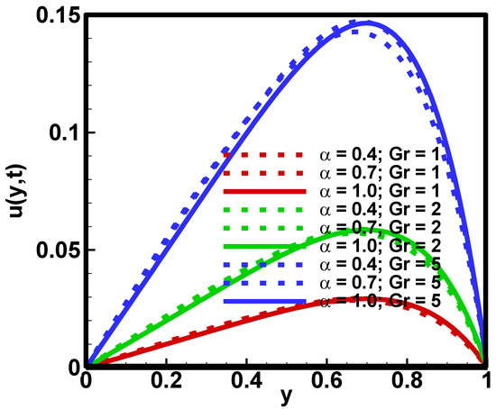 Figure 4 elaborated on the effect of the Grashof number on the fluid velocity profile. The Grashof number is the ratio of thermal buoyancy forces to the viscous forces. The fluid velocity increases by increasing the value of as thermal buoyancy forces dominated the viscous force. Advancement in the fractional parameter α boosted the velocity profile because the momentum boundary layer was reduced by increasing the value of the fractional parameter α. Results for against the fractional parameter are portrayed in Figure 4. It can be noticed that the velocity profile increased for increasing values of ; in addition, the same behavior of the velocity profile is seen for increasing values of .