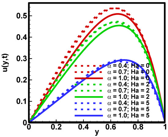 With an enhancement in the strength of the magnetic field parameter (Ha), there is a decrease in fluid velocity. It can be justified as, by enhancing the magnetic field strength, the Lorentz force increased, which shows high resistance to fluid flow. Enhancing the magnetic field parameter amounts to a stronger Lorentz force and hence the rate of heat transfer in the boundary layer is higher. By enhancing the value of the fractional parameter α the momentum boundary layer decreased and became thinnest at , consequently, the velocity increased for increasing values of the fractional parameter α. In Figure 5, the velocity profile is portrayed for Ha = 0 and for , and also for Ha = 2 against the fractional parameter and Ha = 5 against . In Figure 5, it can be seen that the fractional parameter enhanced results in enhancing the fluid velocity profile. But for increasing values of the Hartmann number the fluid velocity decreased.