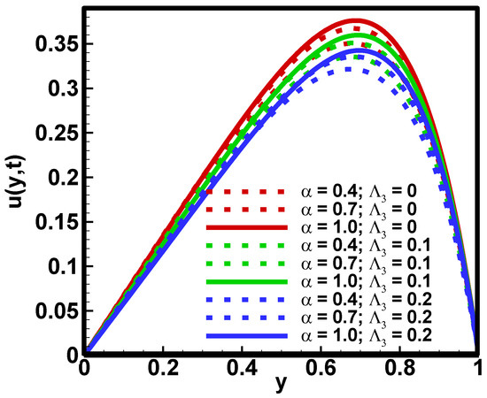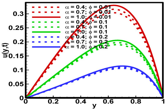 The effect of the volume fraction parameter ( of nanoparticles on the fluid velocity profile is depicted in Figure 6. Advancement in control volume fraction parameter reduced the fluid velocity because by increasing the fluid becomes more viscous. Because the addition of nanoparticles increases the viscosity, consequently, the velocity profile decreases. But the opposite behavior of fluid velocity is observed for the fractional parameter Enlarging the values of α boosted the velocity profile as can be seen in Figure 6. The effect of the volume fraction parameter of nanoparticles on the fluid velocity is reported in [37], and has a good agreement with present results.
