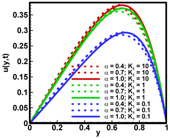 The plots of Figure 7 express the results for the velocity profile of the fractional Oldroyd-B bio-nanofluid against the porosity parameter of the viscoelastic bio-nanofluid. The overall flow regime within a porous medium is well described by Darcy’s law which states that the flow rate of fluids is proportional to the potential energy gradient, because it is the property of porous media that it contains the pores or so-called voids that gives resistance to flowing particles. These expected results are shown in the following Figure 7 an increasing values of porosity parameterdecreases the velocity of the fractional Oldroyd-B bio-nanofluid against increasing values of fractional parameter α.