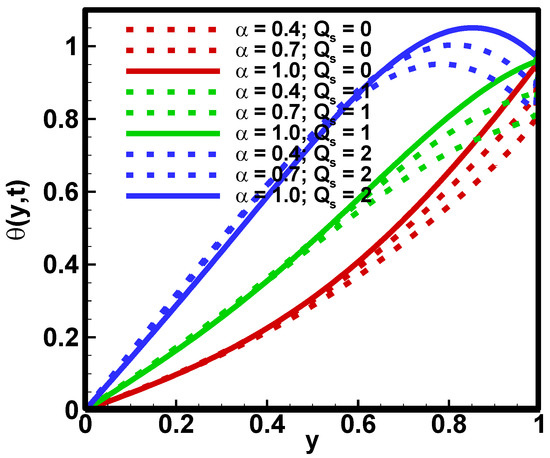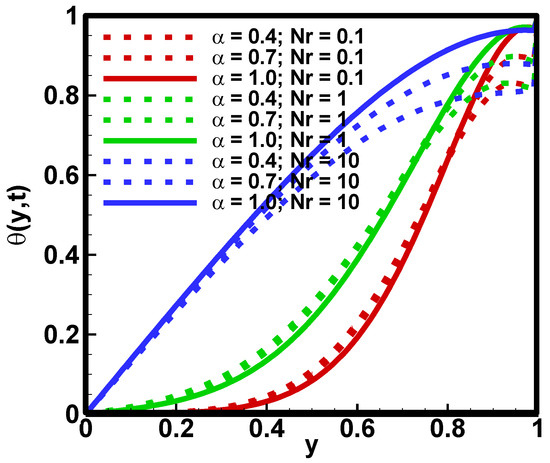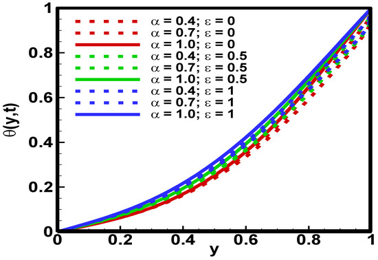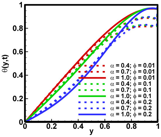 By increasing the volume fraction parameter of nanoparticle () the heat transfer becomes better. Because nanoparticles improved, the heat transfer rate of the base fluid resulted in the temperature of the system decreasing because more heat transferred from the system and cooled the system more quickly, as can be seen in Figure 9. But the opposite behavior of fractional parameter α is seen in Figure 9. The thermal boundary layer becomes thin for increasing values of α and becomes thinnest for . As values of fractional parameter α increased the fluid temperature also increased, as can be observed in Figure 9. In the physical phenomena involving heat transfer, energy loss is the major issue. The idea of the addition of nanoparticles to the base fluid is to control the enthalpy of the system. These expected results are obtained, as depicted in the following Figure 9. The reason behind this is that Copper nanoparticles are good conductors of heat. The addition of Copper nanoparticles in flowing fluids (blood) reduced the energy loss that is the decreased temperature profile.