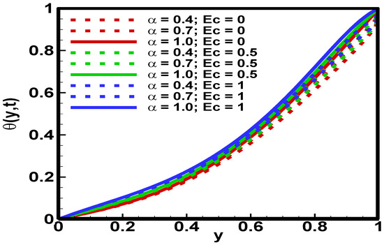 The relative effect of the kinetic energy of flow to the enthalpy difference across the thermal boundary layer is measured by an Eckert number (Ec). An increase in the value of (Ec) means increasing the viscous dissipation and consequently increasing the fluid temperature can be seen in Figure 10. Physically it can be justified that viscous dissipation is an irreversible conversion of kinetic energy into internal heating through an effort that opposes the viscous strain. It is a process where energy is utilized or lost without performing meaningful work. Similar behavior for fractional parameter can be observed in Figure 10. Similar results are reported in [38].