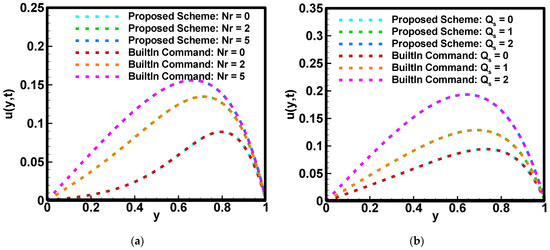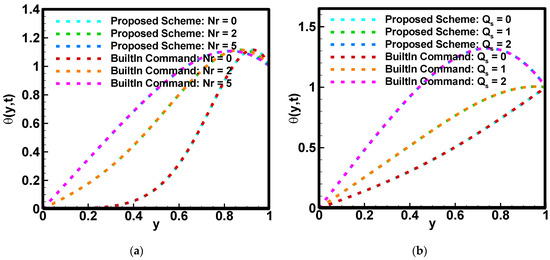 Figure 14 and Figure 15 are plotted to compare the results between the proposed scheme and the Maple built-in command of the dimensionless velocity and temperature for various values of Nr and Qs number for. Results obtained by the proposed scheme and built-in commands are in good agreement as followed from the figure. It can be deduced that the numerical solutions obtained via the proposed method are in excellent agreement with the Maple built-in command results. This shows the correctness and effectiveness of the planned method.