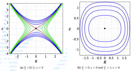 - In Figure 2a, if , the periodic family of orbits in blue degenerates to the equilibrium point, and the two unbounded orbits in blue turn into the extension parts of the unbounded orbits in red. If , the periodic orbits in blue degenerate to the heteroclinic orbits in red, and the unbounded family of orbits in green is converted to the heteroclinic orbit in red as .