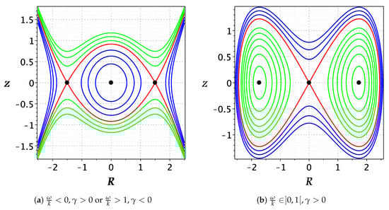 - System (8) has three equilibrium points O and when . For or , the equilibrium point O is the center, while are the saddle points. The phase plane, which is illustrated by Figure 2a, for this case, consists of three different types of orbits based on the values of E. The family of is unbounded orbits in green. The red orbit is a heteroclinic orbit or sometimes is named a connecting orbit due to it connecting the two saddle points . The family of orbits, , in blue, is composed of three separated subfamilies of orbits. Two of them are unbounded and arise outside the heteroclinic orbit, while the inside one is periodic around the center point O. In the case in which , the equilibrium point O is saddle, while the others are centers. All the orbits are bounded for all possible values of the parameter E. The family is a super periodic family of orbit. When , there are two ovals in the homoclinic orbit connecting the saddle point O with itself. For , there are two families of periodic orbits in green. Each of them appears in the left and right oval of the homoclinic orbit.