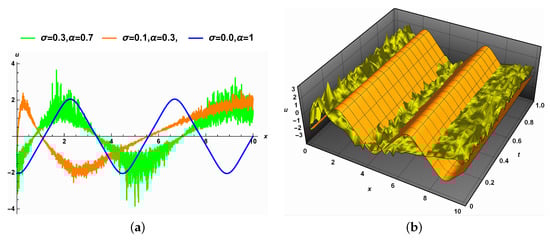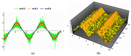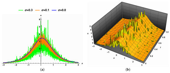 - Influence of the noise:Figure 6a displays the representation of the solution (27). The solution is perturbed around the solution in the deterministic case with , and this causes some small changes in the width of the solution and large changes in the amplitude, as the strength of the noise grows. Furthermore, the 3D representation in Figure 6b outlines the same conclusion.