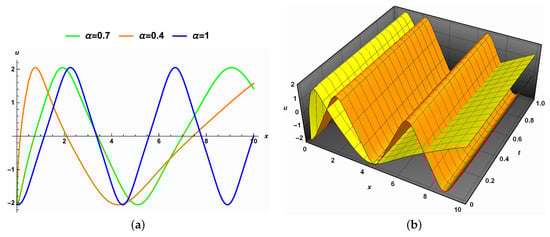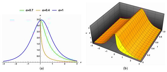 - Influence of the fractional order:Figure 7a clarifies the 2D representation of the solution (27) for different values of the fractional order in the deterministic case, i.e., in the absence of the noise. As the fractional order increases, the width of the solution increases, while the amplitude remains relatively unchanged. Figure 7b illustrates the 3D representation of the solution (27) when without the presence of noise, i.e., .
