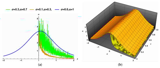 - Effect of the combination of the noise and the fractional order:Figure 8a illustrates the representation of the solution (27) for distinct values of and in addition to the classical case that is represented in blue. The existence of both combines the two previous effects. The amplitude and the width of the solution increase as and grow. Figure 8b outlines the representation of the solution (27), and it gives the same conclusion.
