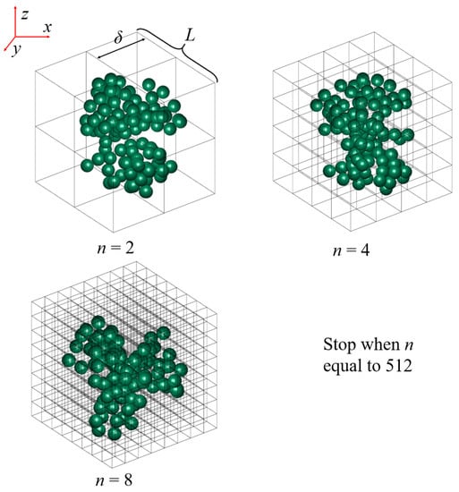 The box-counting method is a relatively simple mathematical method that enables the determination of fractal properties on a single aggregate. This method can estimate the fractal dimension for aggregates with or without self-similarity. As discussed in Wang et al. [], Strenzke et al. [], and Pashminehazar et al. [], the BC method can be used on both 2D and 3D aggregates.