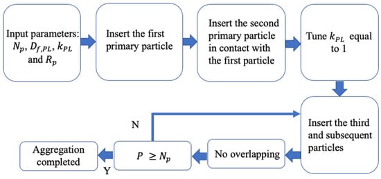 Here, a tunable aggregation model is applied to generate a series of aggregates with various fractal properties and different numbers of primary particles. This is the modified polydisperse tunable sequential aggregation model (MPTSA) from []. In this aggregate generation model, the input parameters are the fractal dimension , the prefactor , the number of primary particles , and the radius of primary particles . The flowchart of the MPTSA model is shown in Figure 3.