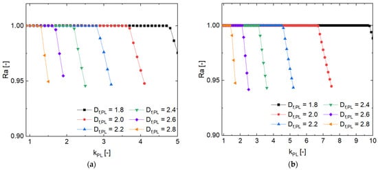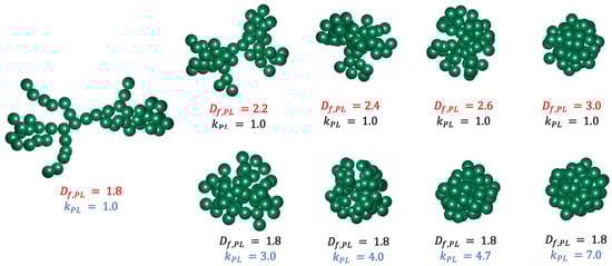 In Figure 5a, when is larger than 4.7 at = 50 and = 1.8, then the of the aggregates is less than 1. This is since with an additional increase of (>4.7), the primary particles of these aggregates can no longer be concentrated further in space. So, of these aggregates does not change with further increasing . For example, as shown in Figure 4, the structural and morphological characteristics of the aggregate with = 1.8 and = 4.7 are the same as those of the aggregate with = 1.8 and = 7.0, with of these two aggregates being same and equal to 0.74 mm. However, calculated formally from Equation (1) continues to decrease as increases, namely from = 0.74 mm for aggregates with = 1.8 and = 4.7, to = 0.6 mm for aggregates with = 1.8 and = 7.0. Therefore, when = 1.8 and > 4.7, the ratio of the aggregates is less than unity, meaning that has moved outside of its effective range.