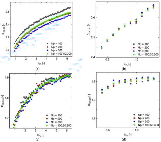 In the further course of evaluation, a projection method proposed by [] is applied to get 2D data for the generated aggregates. Then, both 3D and 2D box-counting methods are applied to estimate 3D BC fractal properties ( and ) and 2D BC fractal properties ( and ) of the generated aggregates. Next, aggregates generated with different (=100, 200 and 300) and (=1.8 and 2.8) are chosen to investigate the relationships between and with . The averages of and over the five realizations are shown in Figure 6 for the selected aggregates. Furthermore, averages ( and ) over each entire aggregate series (with = 100:50:300) are also plotted in Figure 6 against .