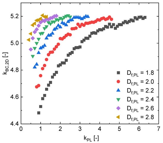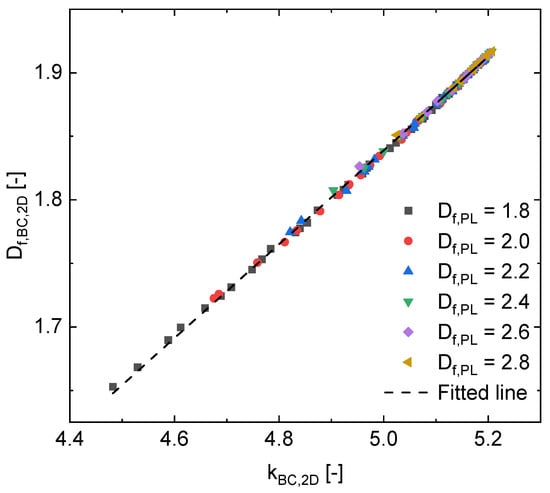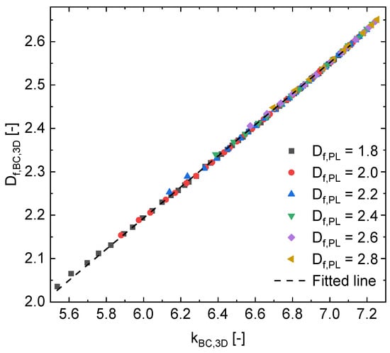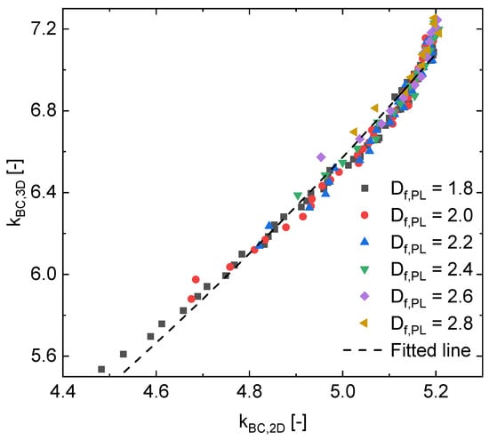 A combination of Equations (11) and (12) can be used to obtain 3D BC fractal properties ( and ) from a given 2D BC prefactor or, by additionally involving the later Equation (17), from a given 2D BC fractal dimension .