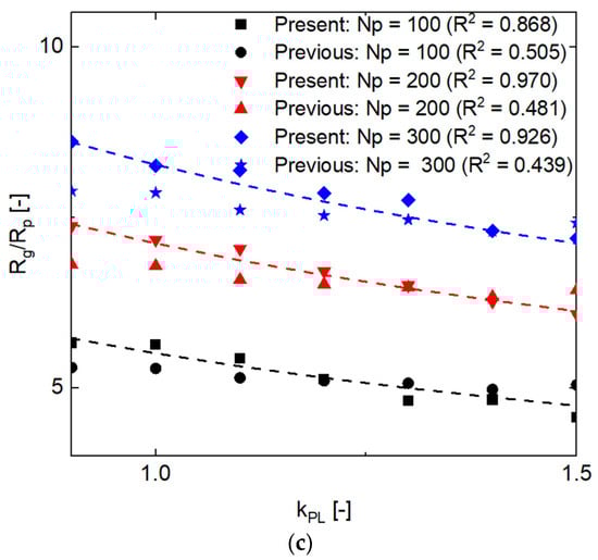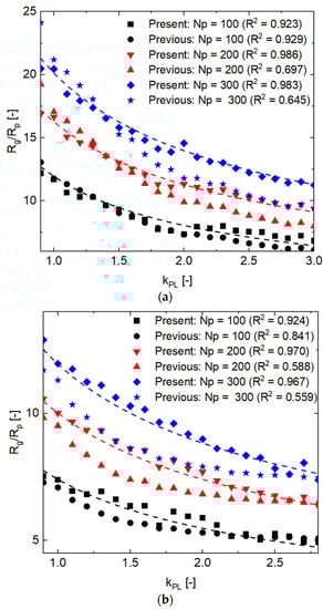 Predicted results ( and ) from Equations (16) and (17) are substituted to Equation (1) to calculate of the new series of aggregates ( = 1.9, 2.3, and 2.7, = 100, 200, and 300). For the sake of comparison, of the new generated aggregates are substituted to Equation (18) to estimate their . Then, keeping as constant and equal to 1, another is estimated by means of predicted from Equation (18). Finally, the two kinds of are compared in Figure 11 based on three (= 100, 200, and 300). calculated from prediction results of the equations in this research (Equations (16) and (17)) are denoted by “present”, calculated from the correlation of the previous work (Equation (18)) are denoted by “previous”. In addition, the standard which is calculated from the input parameters (, , and ) of the MPTSA model is also shown in Figure 11 (dotted lines). The R-square analysis represents the deviation of the predicted (present or previous) to standard .
