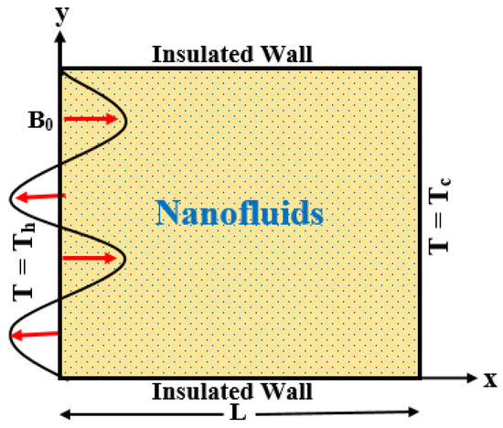 We consider a time-dependent two-dimensional free convective flow of nanofluids inside a square enclosure, where copper (Cu) is taken as the nanoparticles and water (H2O) is taken as the base fluid, considering that the nano-sized particles are dispersed into the base fluid homogenously. The other type of nano-sized particles and base fluid are considered in this study. The upper and bottom walls are insulated. The right vertical sidewall is cooled at lower heat Tc, whereas the left vertical side is warmed at higher heat Th (Tc < Th). The magnetic field is employed non-uniformly, which is horizontally periodic. The relation of the magnetic term is represented by , where B0 represents the periodic magnetic field amplitude and represents the magnetic field period. It is also assumed that no thermal and no dynamical slip occurs within the base fluid and nanoparticles. The acceleration of gravitational force works at the negative y-axis. All rigid boundaries are supposed as no-slip walls. The coordinate systems and geometry are schematically represented in Figure 1, where x and y represent the Cartesian coordinates. The properties of different nano-sized particles and water are given in Table 1. Moreover, six types of nanofluids are deliberated to survey the best performance of temperature transport augmentation compared to the base fluid.