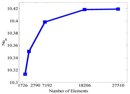 A comprehensive grid testing procedure has been devoted for the square cavity of the current problem when ϕ = 0.04, Ha = 30, Ra = 105, d = 10 nm and n = 3. Five different non-uniform grid systems containing element numbers 1726, 2790, 7192, 18,206, and 27,510 are examined in this study. For the element numbers mentioned earlier, the Average Nusselt number (Nuav) has been calculated for checking the development of fineness of the grid. In this study, the element size 18,206 depicts an ordinary variety of outcomes concerning the average Nusselt number (Nuav) with other elements, 27,510, presented in Figure 2. Therefore, the element size 18,206 is employed for a grid-independent solution.