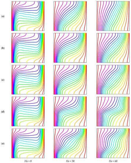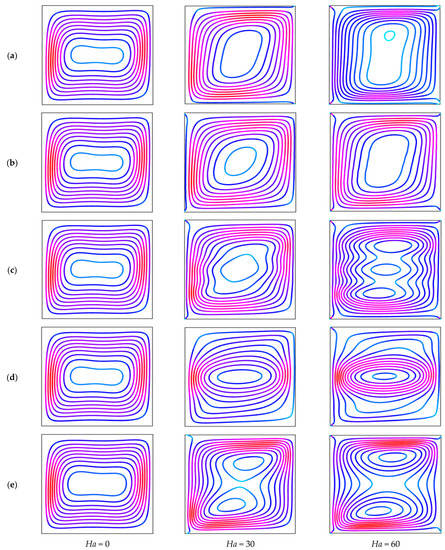 Figure 3 illustrates the variation in the streamlines with the period of the magnetic effect and Hartmann number when ϕ = 0.04, Ra = 106, n = 3, and d = 10 nm. The outcome shows that the classical natural convection occurs inside the enclosure at Hartmann number Ha = 0, but the patterns of the streamlines completely change by employing magnetic effects. A strong counteraction force is generated by Lorentz forces of the applied magnetic field for the increment of Ha, and as a result, the flow circulation diminishes. Furthermore, the flow circulation changes from horizontal to vertical state with the increment of the Hartmann number (Ha). Furthermore, an interesting pattern of the streamlines is seen for the changes of the period of the magnetic effect (λ). The streamline figure for uniform magnetic field (umf) is listed in the first row of Figure 3. At low period λ (λ = 0.1), the streamlines are almost similar to the uniform magnetic field because the volume force employed by the low periodic magnetic effect and the uniform magnetic field is almost the same. At λ = 0.1, the streamlines neighboring the vertical walls are deviated from the straight lines because of the gradient of the interchanging magnitude of Lorentz forces employed by the flow field along the y coordinate. Consequently, the streamlines create a sawtooth form. With the increase of the period of the magnetic field (λ), the Lorentz force gradient decreases along the vertical walls, and the streamline patterns become straight lines. Moreover, the circulation strength within the enclosure is enhanced by amplifying the period of the magnetic effect because. With the increase of λ, the average Lorentz forces in the flow field diminishes. The streamlines are more squeezed near the hot wall for λ = 0.25, and λ = 0.5. For the period λ = 1, two symmetrical vortex cells are generated neighborly in the cavity’s bottom and upper regions. Furthermore, at the period λ = 0.25, three central circulation cells with similar patterns are seen for a higher Hartmann number (Ha).