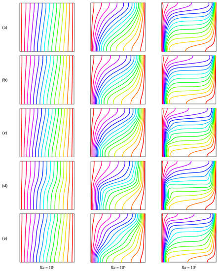 The isotherms for various Rayleigh numbers (Ra) and the magnetic field period (λ) when Ha = 30, ϕ = 0.04, and d = 10 nm are displayed in Figure 6. The configuration of the isothermal lines changes with the variations of the period of the magnetic field. For different λ, a changing variety of isothermal lines is observed from the vertical position to the horizontal for the increase of Ra. This outcome is a result of the augmentation of buoyancy forces. Therefore, convection is a significant mood of temperature distribution and its dominance over conduction. The uniform state of the isothermal line changes its uniform status at Ra = 105, and it is also more distorted, and the flow intensity enhances with higher Ra (Ra = 106). In addition, at different λ, the isothermal lines change completely with the enhancement of Ra because of the growth of the buoyancy force and dominance of convection over conduction temperature transport.