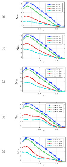 Local Nusselt number for Hartmann number (Ha) and (a) umf, (b) λ = 0.1, (c) λ = 0.25, (d) λ = 0.5, and (e) λ = 1 when Ra = 106, ϕ = 0.04, d = 10 nm, n = 3, and τ = 1.