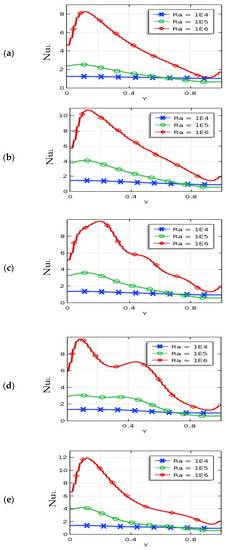 Local Nusselt number for Rayleigh number (Ra) and (a) umf, (b) λ = 0.1, (c) λ = 0.25, (d) λ = 0.5, and (e) λ = 1 when Ha = 30, d = 10 nm, ϕ = 0.04, n = 3, and τ = 1.