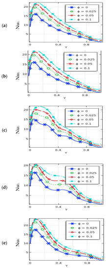 Local Nusselt number for nanoparticles volume (ϕ), and (a) umf, (b) λ = 0.1, (c) λ = 0.25, (d) λ = 0.5, and (e) λ = 1 when Ra = 106, Ha = 30, d = 10 nm, n = 3, and τ = 1.
