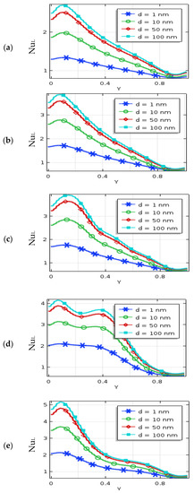 Local Nusselt Number for nanoparticles diameter (d) and (a) umf, (b) λ = 0.1, (c) λ = 0.25, (d) λ = 0.5, and (e) λ = 1 when Ra = 106, Ha = 30, n = 3, ϕ = 0.04, and τ = 1.